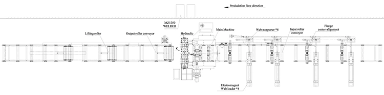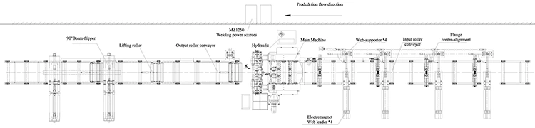 کچھ صارفین کو پروڈکشن آؤٹ پٹ کو بڑھانے کی ضرورت ہوسکتی ہے ، انہیں ویلڈنگ اسٹیشن کے 2 سیٹوں پر مشتمل ایک ویلڈنگ لائن کی ضرورت ہوتی ہے۔ ویلڈنگ کے لئے پہلا ویلڈنگ اسٹیشن جس میں پہلے فلانج اور ویب کو ٹی بیم تشکیل دیا جاتا ہے ، ویلڈڈ ٹی بیم کو ویلڈنگ کرنے کے لئے دوسرا ایک اور ایچ بیم بنانے کے لئے دوسرا فلاج۔